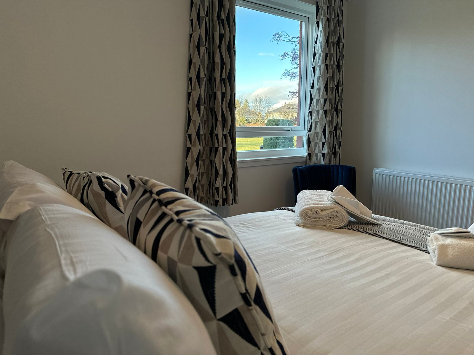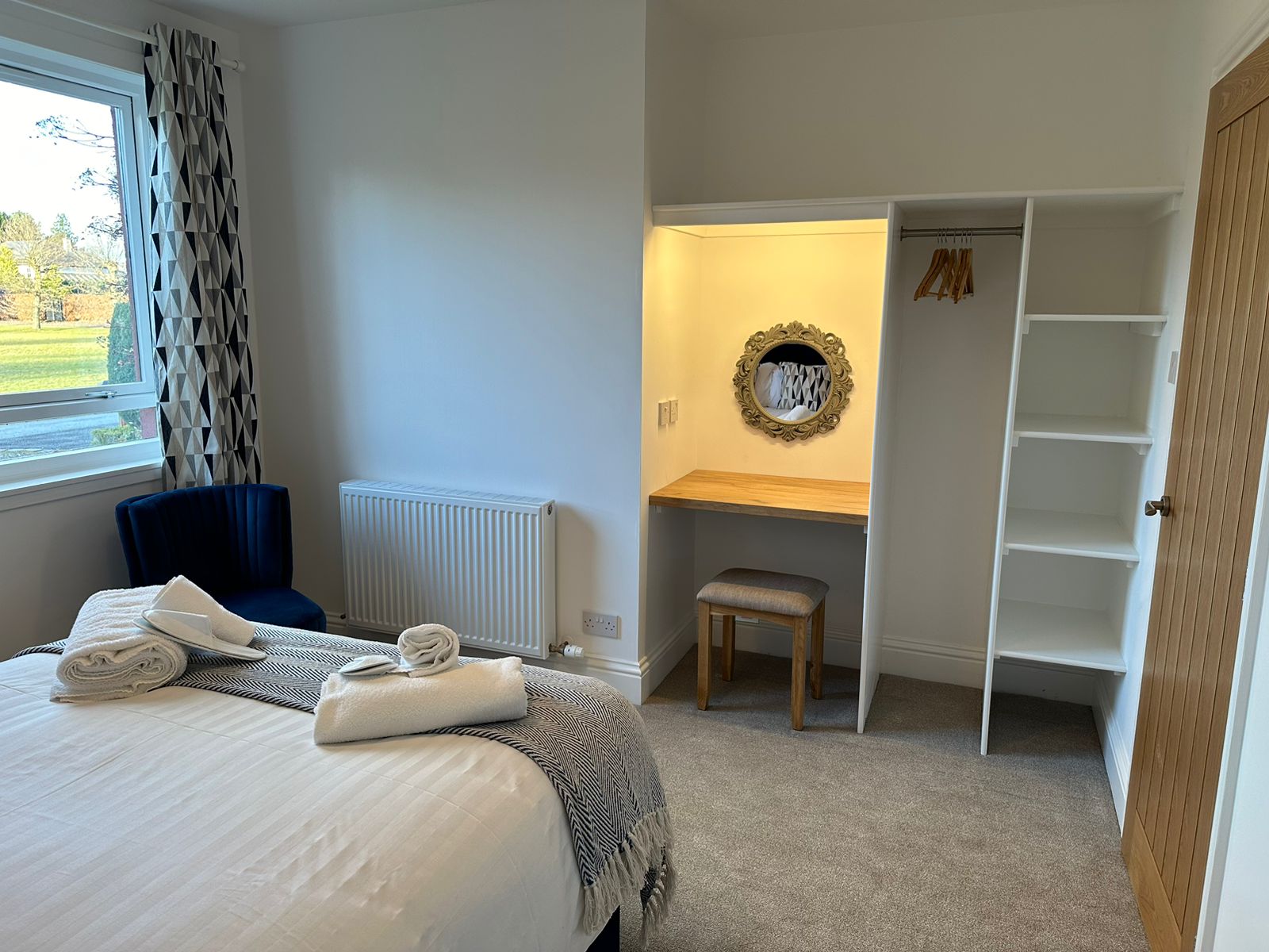 Welcome to Bedroom 3, a bright double room with front views. Built-in storage, a dresser with mirror and light, and bedside touch lamps with USB sockets await. Relax in the stylish blue chair—a perfect blend of comfort and convenience.